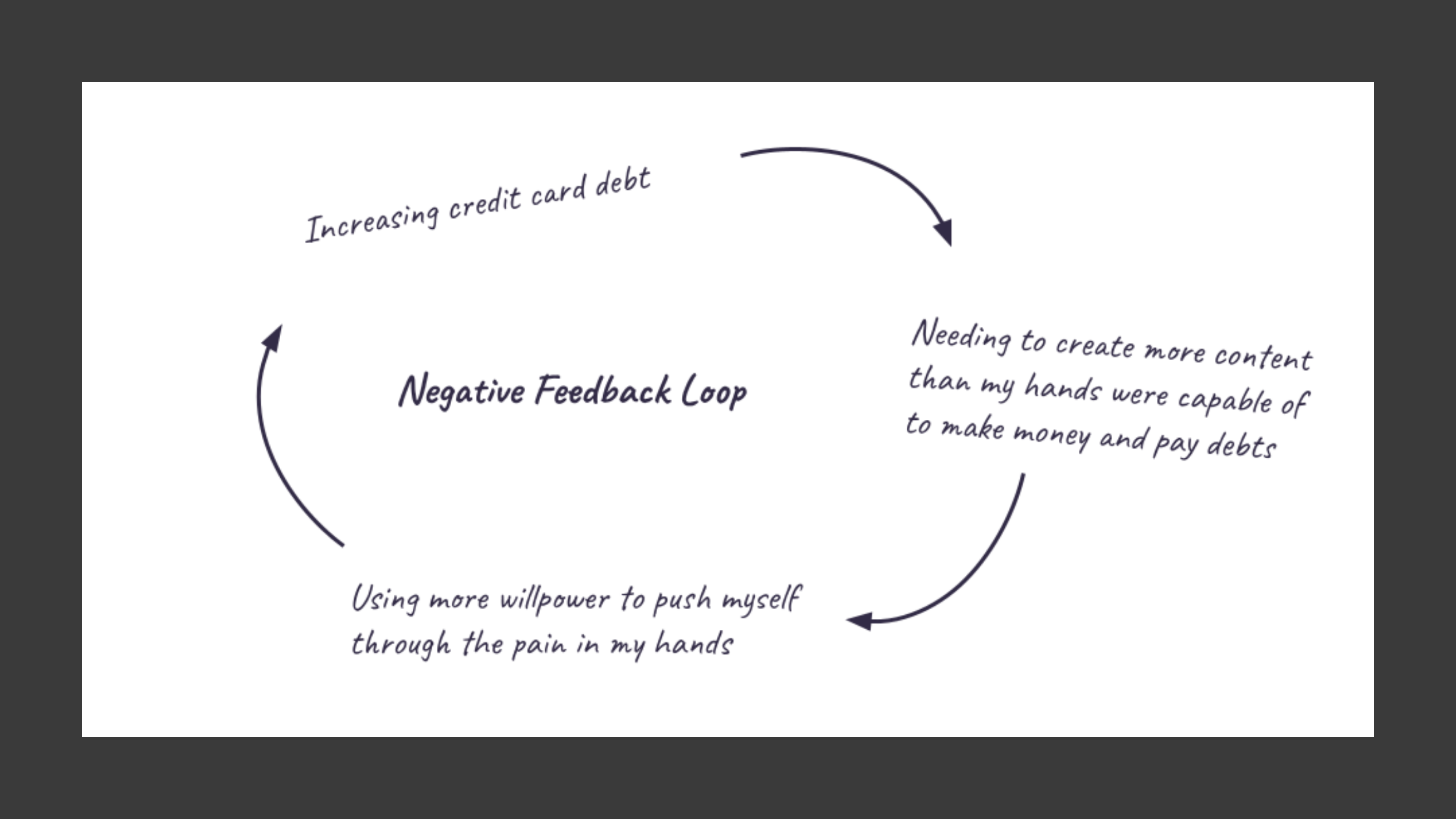 Now it was increasing credit card debt, needing to create as much content as possible to pay it, and using willpower to push my hands through the pain of typing.